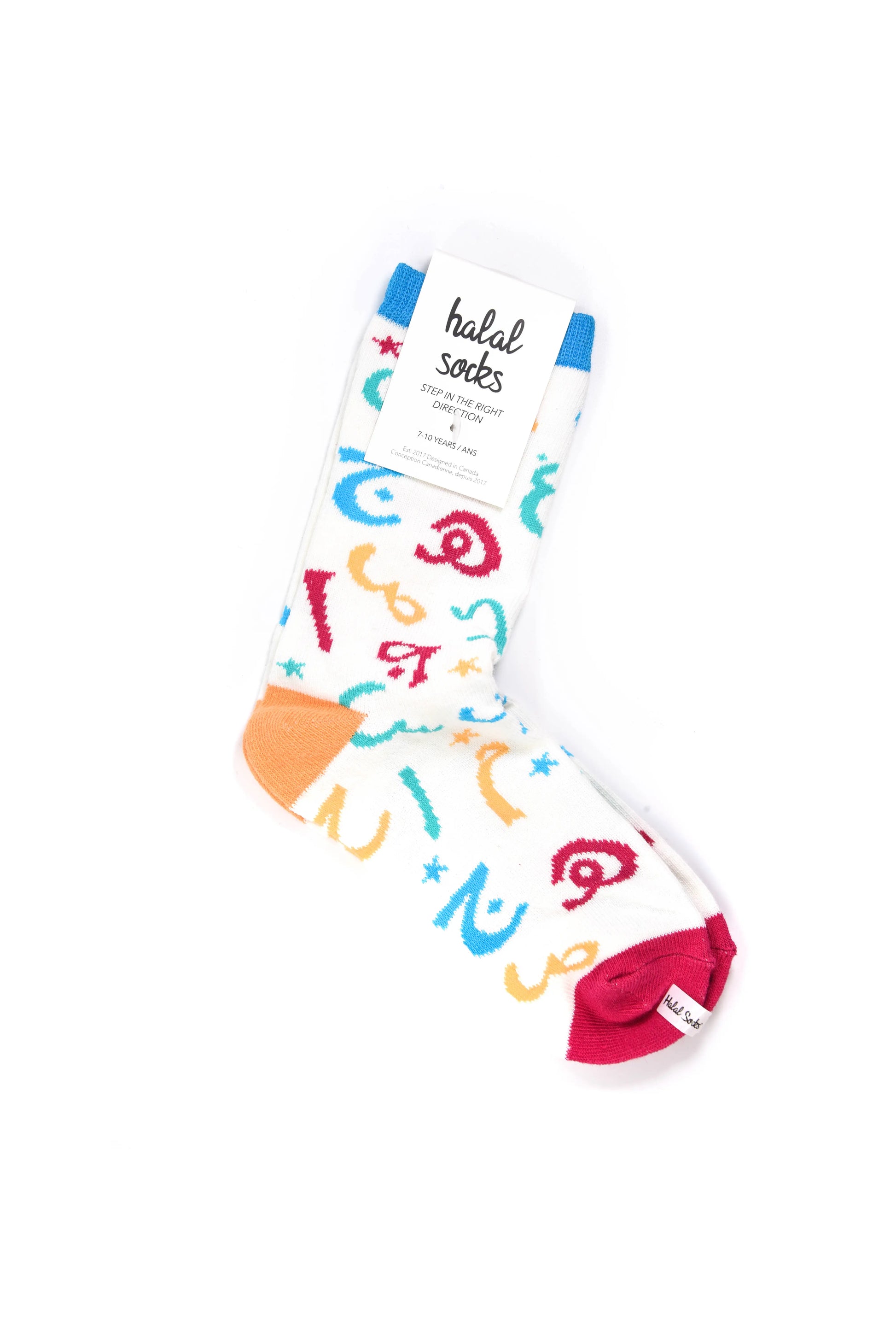 Introduce your child to Arabic letters with our fun and colorful socks! Available in sizes for 4-6 and 7-10 year olds, these socks make learning letters exciting and interactive. Perfect for teaching young minds in a unique and engaging way. Also check out our Arabic number version!