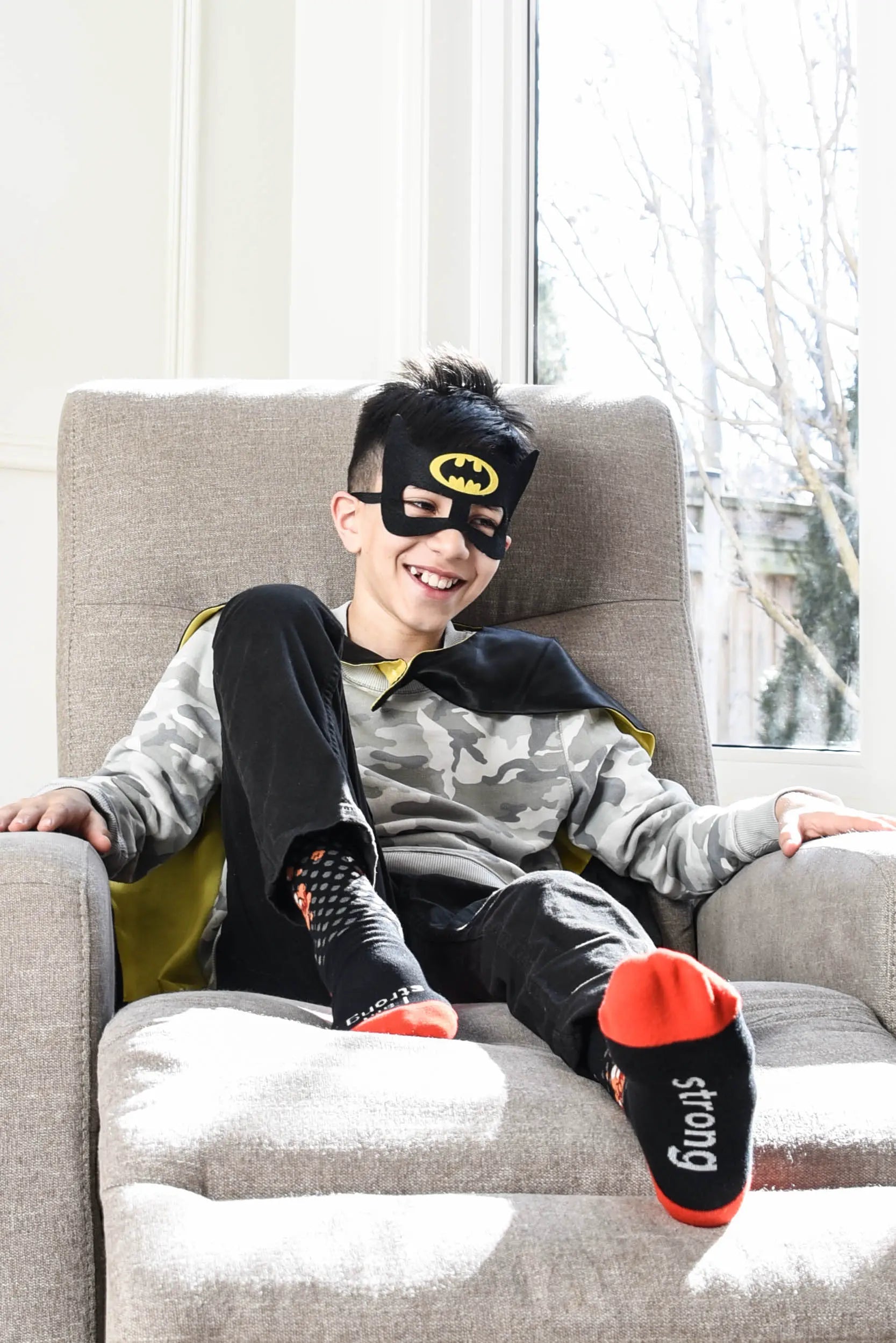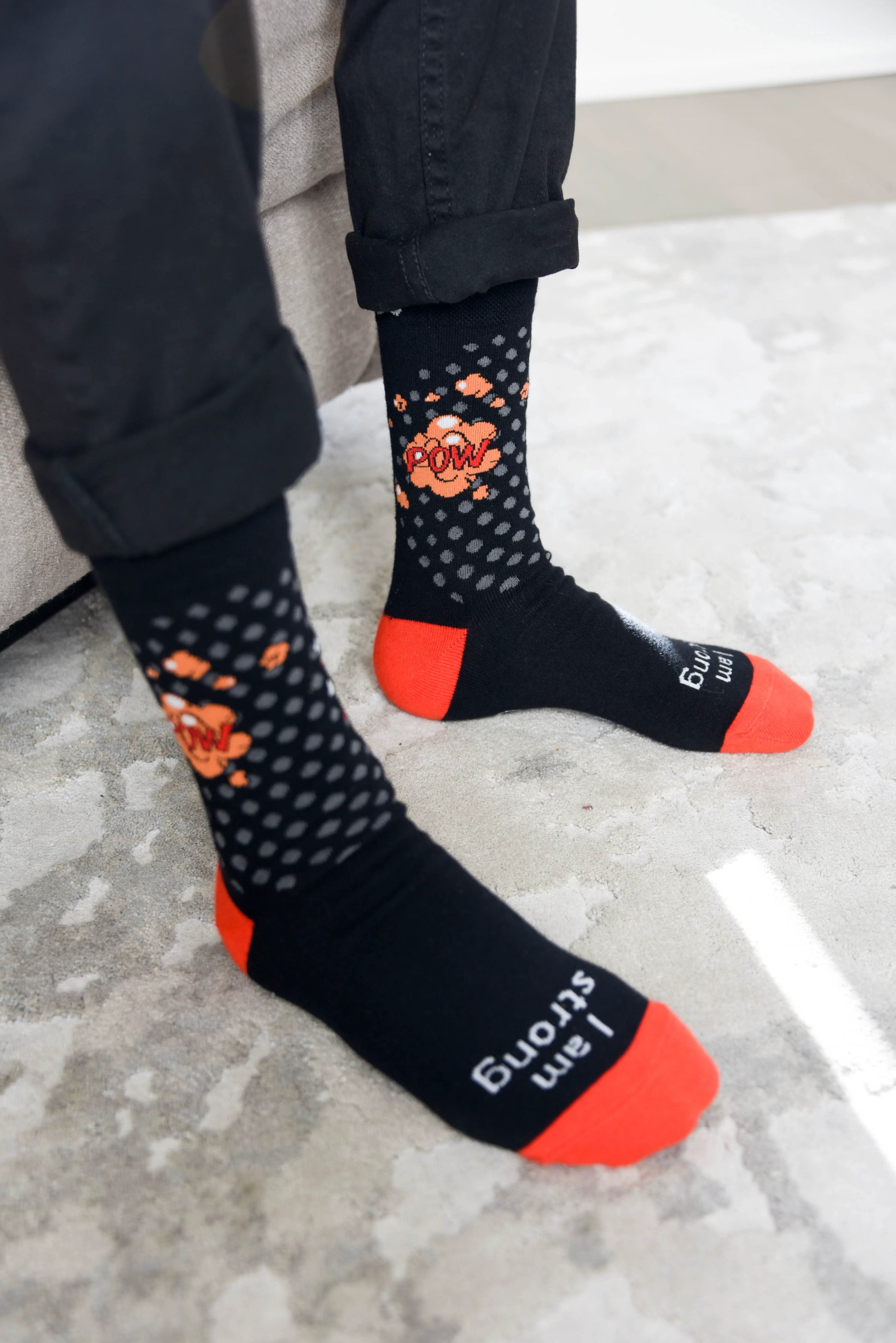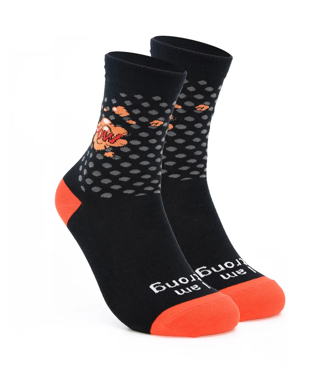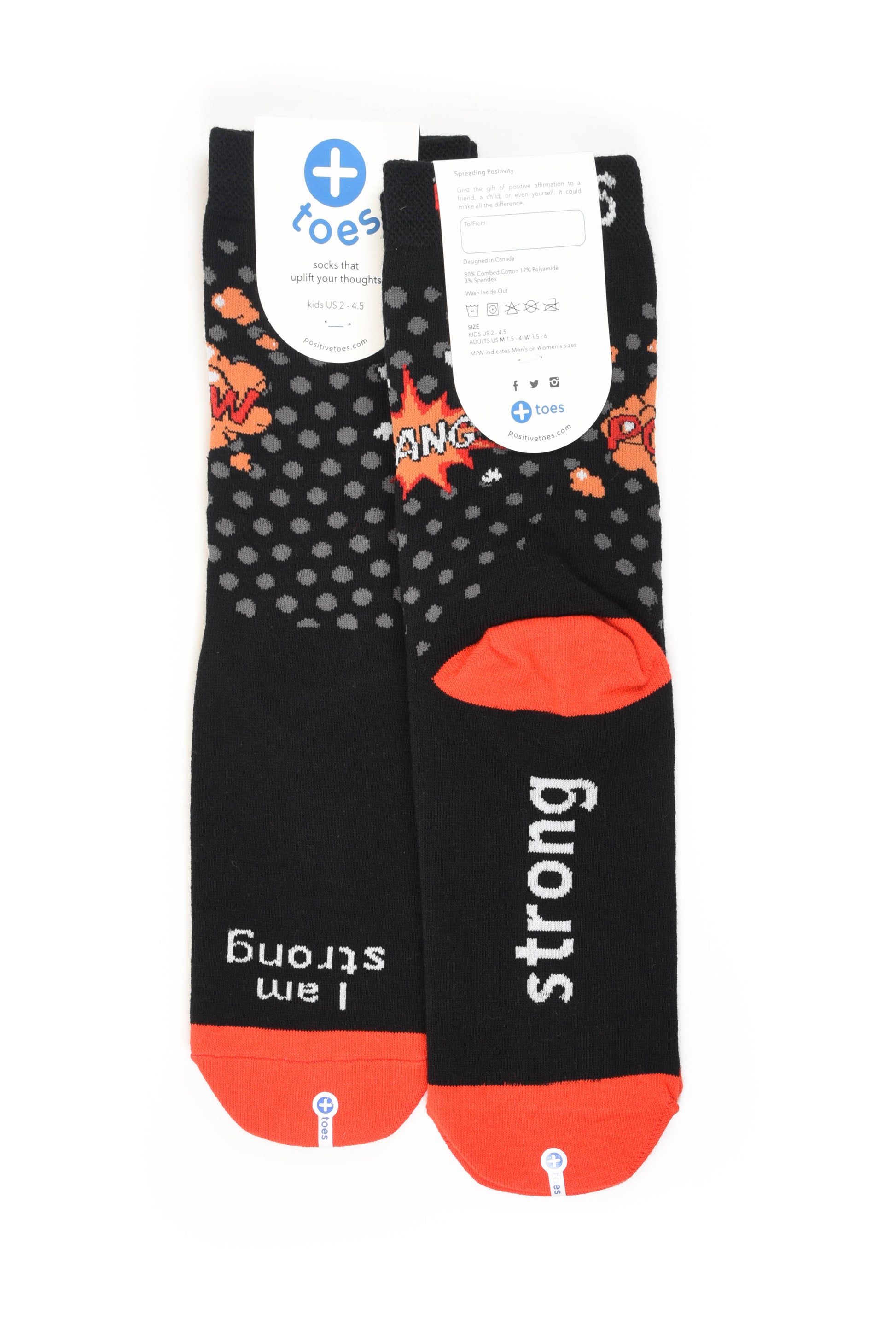 Strengthen yourself and become more resilient as you remind yourself to be strong with this motivational accessory. This black pair with “I am strong” written at the toe, “strong” written at the bottom, and superhero words like “bang” and “pow” on the ankle, will help you tackle your day. Perfect for gift giving, be sure to stock up for wearing and sharing with those special people in your life.