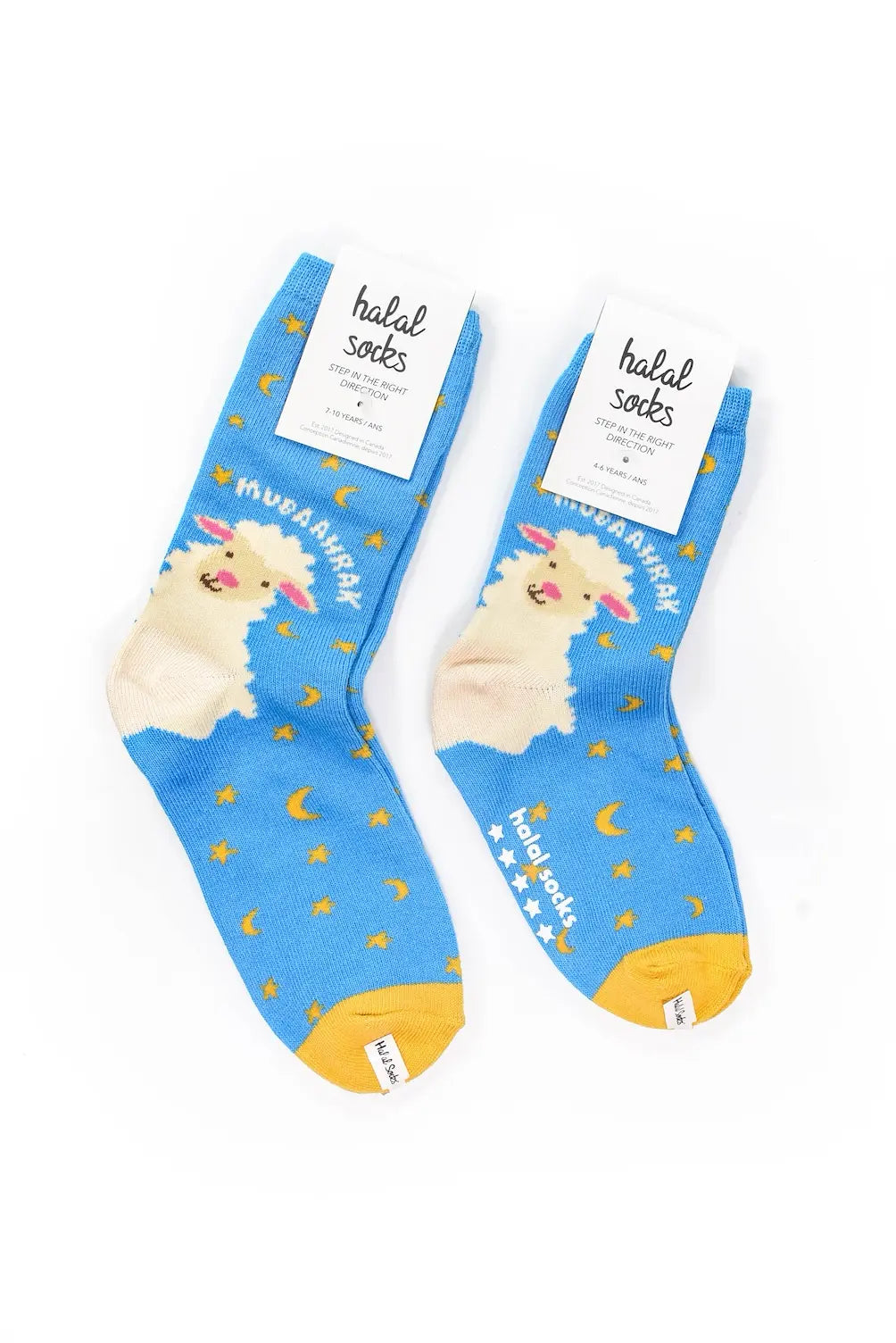 These socks are perfect for your little ones! They feature a playful sheep peeking from the heel and the words "Mubaaahrak", adding a touch of excitement to their outfit. With stars, presents, and a bright yellow toe, these socks are both fun and comfortable.