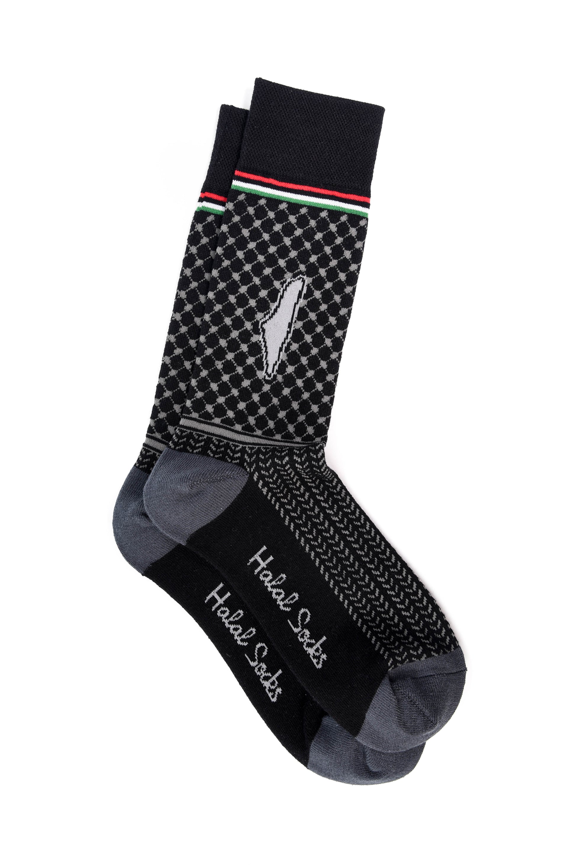 Featuring a striking black and grey color scheme and a bold Kufiya pattern, this sock is sure to turn heads wherever you go. But what really sets it apart is the intricate map of Palestine woven into the design. But that’s not all – the sock also includes other elements of Palestinian culture in its design. The intricate fishnet pattern is a nod to the traditional fishing culture of Palestine, while the olive trees that dot the la ndscape represent the country’s rich agricultural heritage. Together, these elements come together to create a truly unique and meaningful piece of clothing.