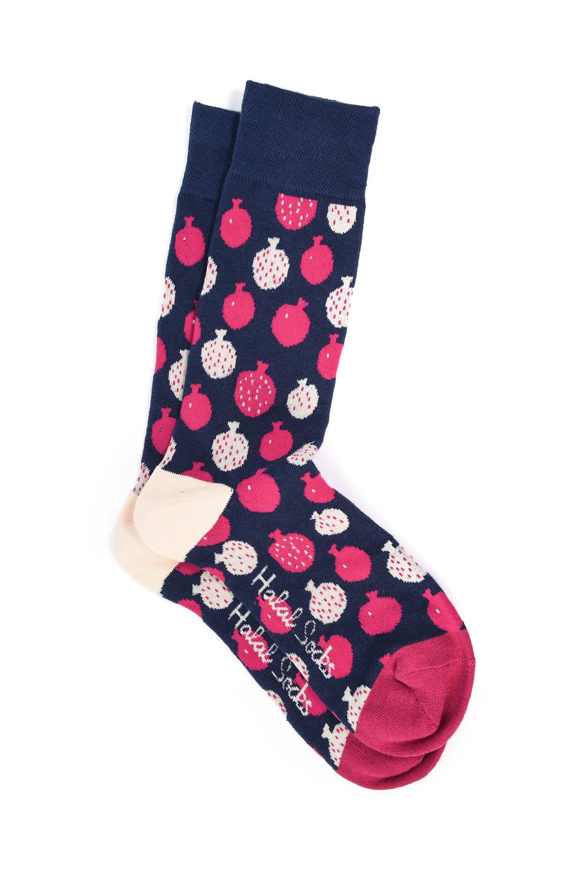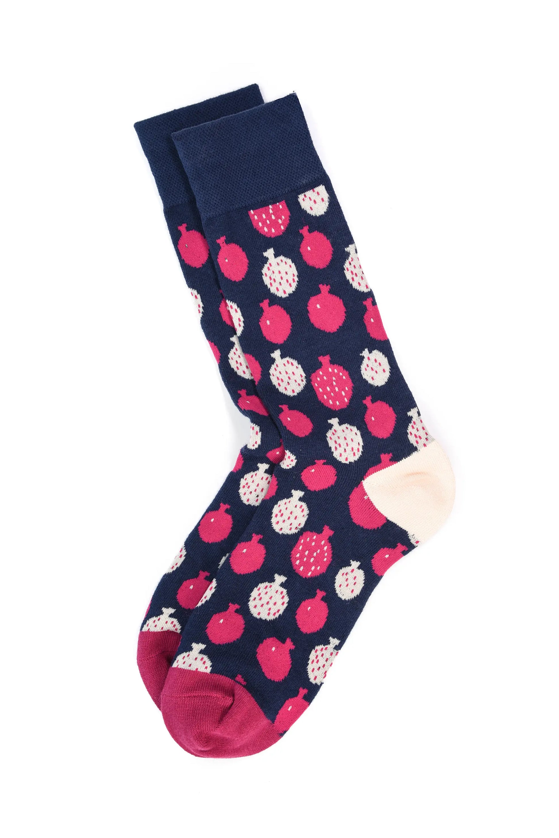 Step into a world of vibrant color and irresistible charm with our Pomegranate socks! Bursting with rich hues of crimson, our socks feature exquisite pomegranate motifs set against a striking navy background, creating a captivating contrast that's sure to turn heads.